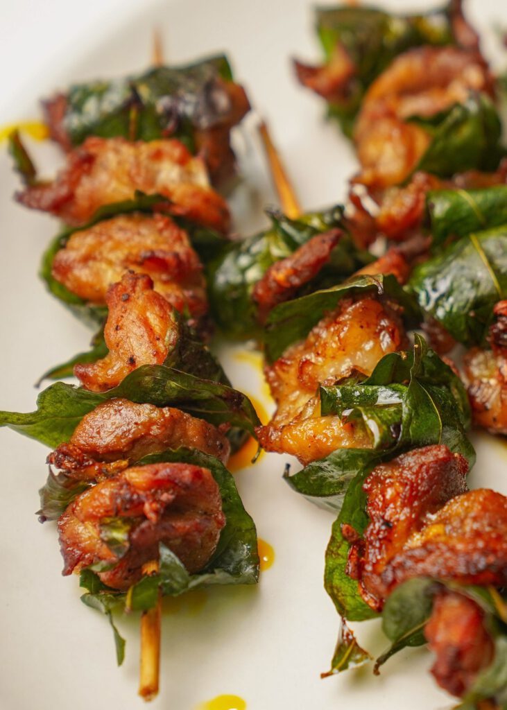 Thịt heo rẫy thái miếng, tẩm ướp đậm đà, xiên vào que tre và bọc lá dong hoặc lá chuối trước khi nướng. Món này có mùi thơm đặc trưng, vị ngọt của thịt hòa quyện cùng gia vị, chấm muối tiêu rừng rất đúng điệu.