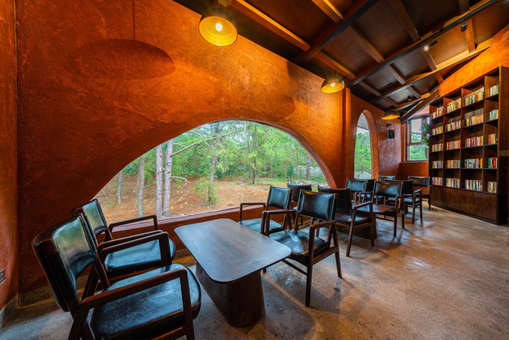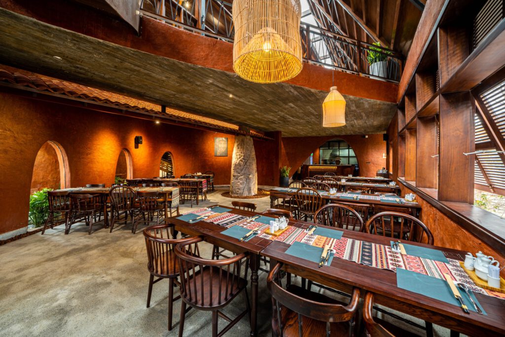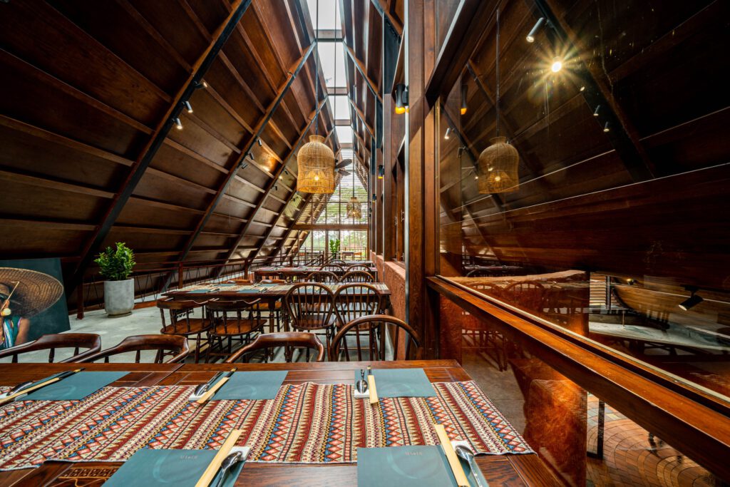 Ngay từ cái nhìn đầu tiên, MA.DE Bistro Măng Đen đã gây ấn tượng mạnh mẽ với lối kiến trúc đặc trưng. Quán không chỉ đơn thuần là một công trình xây dựng, mà là một tác phẩm nghệ thuật dung hòa giữa sự tinh tế, hiện đại và những giá trị văn hóa bản địa sâu sắc của Tây Nguyên. Mỗi chi tiết trong thiết kế đều được chăm chút tỉ mỉ, từ cách bố trí nội thất đến việc lựa chọn vật liệu, tất cả đều hướng đến việc tạo ra một không gian ấm áp, gần gũi nhưng không kém phần sang trọng. Sự pha trộn này không chỉ mang đến vẻ đẹp thị giác mà còn kể câu chuyện về sự giao thoa giữa quá khứ và hiện tại, giữa truyền thống và đổi mới.