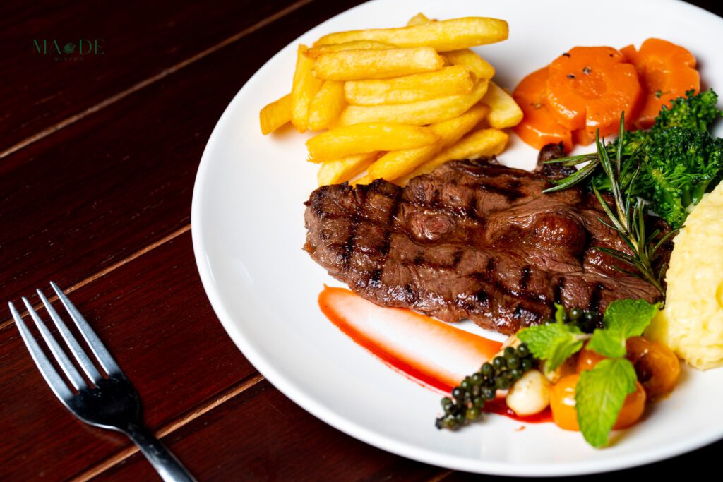 Không chỉ nổi tiếng với đồ uống, MA.DE Bistro Măng Đen còn là điểm đến lý tưởng cho những ai yêu thích ẩm thực châu Âu. Thực đơn tại đây rất phong phú, mang đến những món ăn sang trọng, được chế biến từ nguyên liệu tươi ngon và chất lượng. Đặc biệt, món thịt bò steak theo phong cách Pháp là một trong những điểm nhấn không thể bỏ qua. Miếng steak được nướng vừa tới, giữ trọn vị ngọt tự nhiên của thịt, kết hợp cùng các loại sốt đặc biệt, tạo nên một hương vị khó cưỡng. Đây là lựa chọn hoàn hảo cho một bữa tối lãng mạn hoặc một buổi gặp gỡ quan trọng, mang đến cảm giác như đang thưởng thức ẩm thực tại một nhà hàng cao cấp ở châu Âu ngay giữa lòng Măng Đen.
