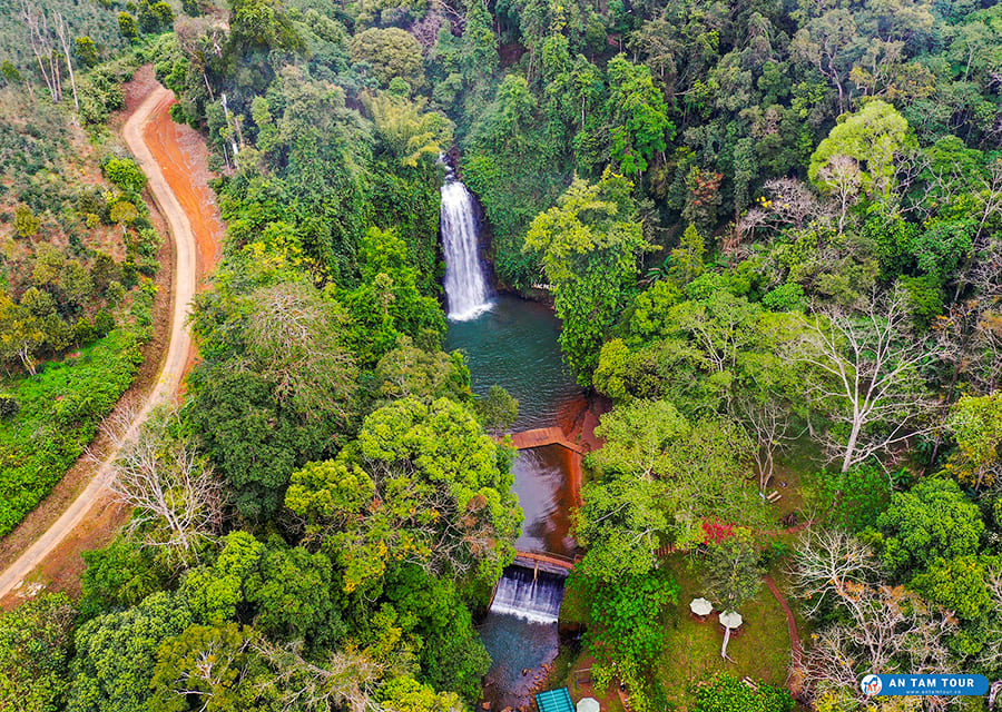 Con đường dẫn vào thác được bao bọc bởi những hàng cây xanh mướt, mang đến cảm giác trong lành, mát mẻ ngay cả khi chưa chạm tới dòng nước. Cảnh quan dọc đường đi cũng là một phần trải nghiệm thú vị, với những đồi núi trập trùng và không khí đặc trưng của vùng cao nguyên.