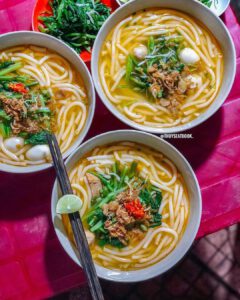 3 Bún đỏ Nước dùng màu đỏ đặc trưng, gạch cua, trứng cút, tóp mỡ.